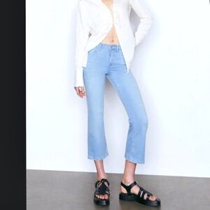 A cropped bootcut jean in a modern bright-blue wash. Designed with a comfortable contour waistband that’s form-fitting at the top and tapers out from the knee into a slight kick.