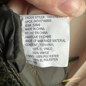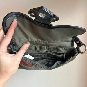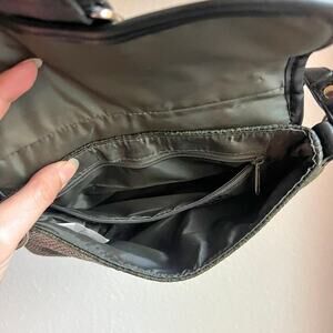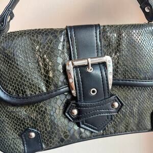 New green and black faux leather and vinyl snake print handbag with rhinestone buckle detail at front. Snap fold over closure. 8" black shoulder strap. Fully lined with inner cardholder and zipper pocket. 9.5" L x 5" H