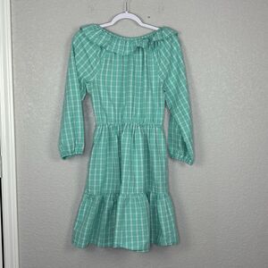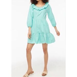 This is a new J.CREW dress in size 4, featuring a mini length, plaid pattern in green cotton seersucker fabric. It has a ruffleneck, long sleeves, and a fit & flare A-line style. Featuring balloon sleeves, elastic back waist and a hidden side zipper.