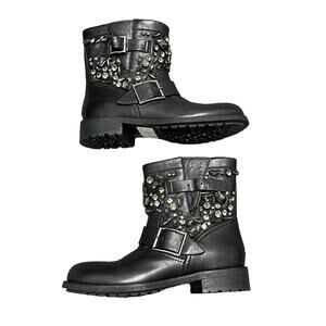 • Features: Pull on biker style boots, Buckle accents on sides, Black leather upper with Black and Gunmetal gray crystal embellishments, Black rubber bottom soles, Short block heel, Beige leather inside lining, Jimmy Choo Youth Biker Leather Boot