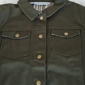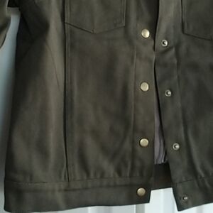 American Rhino, Made in Kenya Canvas Jacket M,  Kenyan Canvas,  Striped lining, snap brass Buttons, side pockets, relaxed fit.   Unisex. Pit to pit 20", waist 20". Color Green.  Excellent quality and durability.  Brand new without tags.  Orig 145. Unisex Jacket.