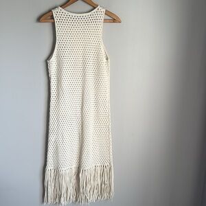 Flowy fringe on the hem complements the crocheted design of this dress that works layered over a look or solo for a daring exposed-underthings vibe.