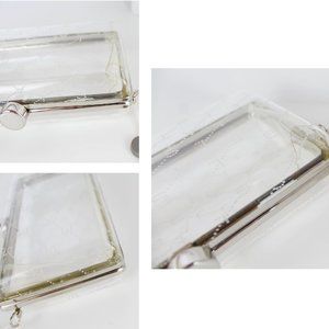 Transparent acrylic clutch featuring logo pattern engraved throughout. Faux-leather trim in black throughout. Detachable and adjustable logo webbing shoulder strap in black and beige with lanyard clasp fastening. Logo engraved at top. Magnetic hinged opening. Expansion panels at interior. Silver-tone hardware.