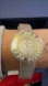 Authentic Swarovski Watch, round gold-tone stainless steel case; 35mm, with crystal bezels - floating crystal bezels on outer ring, white mother of pearl face with gold-tone index markers, creamy gold-tone leather strap (17mm), water resistant up to 30m, Made in Switzerland, quartz mechanism, sapphire crystal. Article no. 5027203.