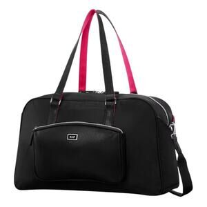This sleek black and hot pink functional bag is perfect for your next getaway with its convertible design -- wear it as a shoulder bag, crossbody (removeable strap), or carry it by the handles
