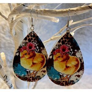 NEW Shabby Chic Farmhouse Leopard Print, Yellow Chick With Pink Flower And A Splash Of Turquoise Faux Leather Teardrop Dangle Earrings.