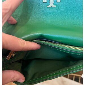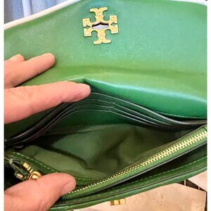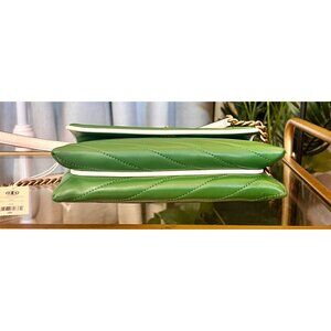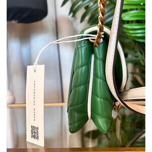 Up for grabs is a beautiful authentic Tory Burch soft chevron-quilted kelly green leather, trimmed in colorful contrast cream piping and finished with a chain-and-leather crossbody strap.