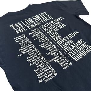 Black t-shirt featuring photos of Taylor Swift printed on front and "Taylor Swift | The Eras Tour" printed on wearer's left sleeve with "Taylor Swift | The Eras Tour", tour locations, and Taylor Swift album titles printed on back.