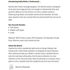 Named after India's teenage daughter, the Domino dress is designed to be worn by all ages but the mini-length is intentionally flirty and youthful. Balance out the shorter cut with a modest neckline, flattering long sleeve, and subtle volume at the shoulder. As India says, leopard is the new neutral that can (and should!) be worn by all ages.