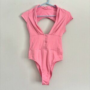 NWOT HAH Bodysuit, women’s size medium! Solid pink, short sleeves, partial front button closure, back cut-out with ruched drawstring.