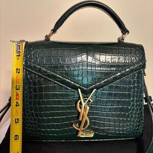 The product is a rare YSL Calfskin Crocodile Embossed Mini Monogram Cassandra shoulder bag (L: 8" x W: 6" x D: 2.5") featuring gold hardware. Made of leather with a green exterior color and black lining, this mini bag is from the Saint Laurent Cassandra product line. It comes with its original dust bag and is of Italian manufacture. Perfect for women who appreciate luxury and unique accessories, this stylish bag combines elegance and sophistication with its gold accents and distinct design. YSL dust bag is also included!