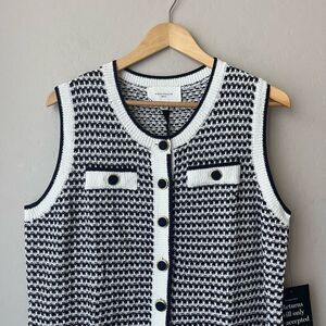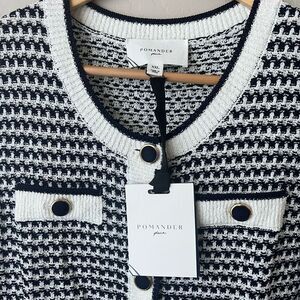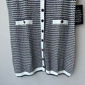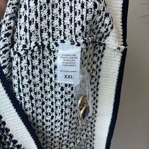 The Navy Stripe Bardot Dress from Tuckernuck’s Pomander Place is a chic mini that can seamlessly take you from desk to drinks. This sleek style boasts a front button placket, four front pockets, and a classic knit fabric that is elevated yet comfortable. Crewneck. Sleeveless. Decorative double-breasted + front hip pockets with button detail. Contrast trim. Mini length. Navy blue and white. Size XXL.
