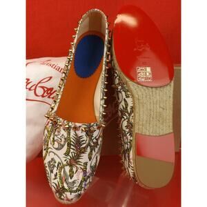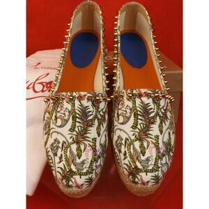 IVORY MULTI COLOR CANVAS "ARES" TISSUE LOUBI JUNGLE OLONA PRINT GOLD TONE METAL STUDS SPIKES FLAT ESPADRILLES