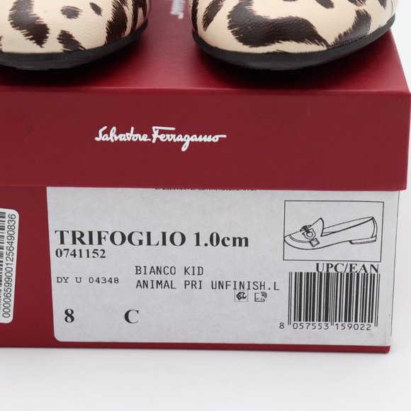 NIB Salvatore Ferragamo Trifoglio Gancini Bit Leopard Print Loafers Brand New in original box, 100% Guaranteed Authentic!! MFSRP: $695.00 +tax Color: BIANCO/BONE Sizes: 6.5/36.5 or 8/38 Width: C 0.5" flat heel Adorned with signature Gancini bit Notched, leather-piped topline Almond toe with apron stitching Leather outsole with custom rubber island for grip Napa leather lining Made in Italy