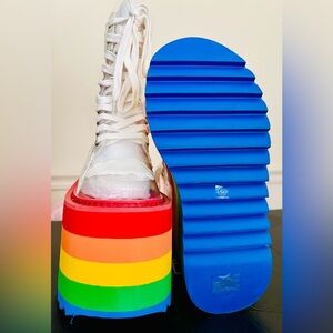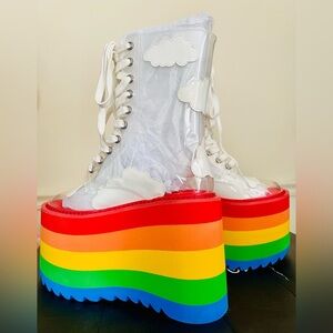 when perfectly paired with rainbow skies, makes the most uplifting vibe! These combat boots have a clear vinyl construction with white cloud appliques, rainbow striped platform soles, thick treaded outsoles, and adjustable front lace-up closures.
