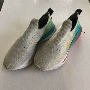 NIKE REACT Infinity Flyknit Premium Running Shoes 9.5 US. Still in very good condition. No rips or tears, just showing some dirt stains from normal use. Noticeable cosmetic issue on the red part of the left shoe. Please see last photo, price offered reflects this issue.