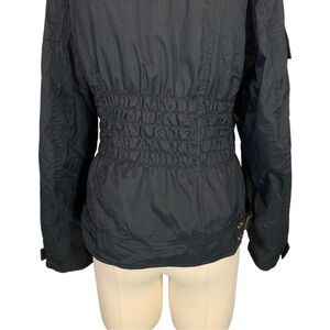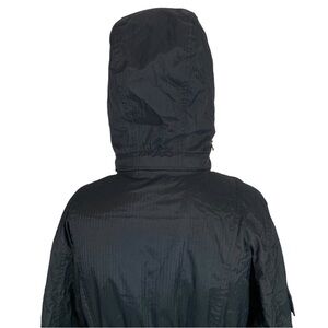 Features: Lightweight, but very warm snow ski jacket. Long sleeves. Smocked back. Arm vents. Pockets thoughout. Hooded. Zip closure.