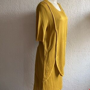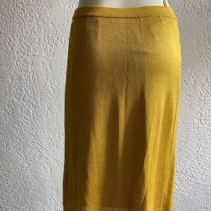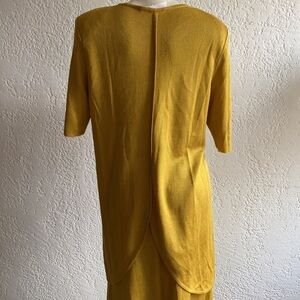NINA RICCI PARIS VTG mustard color siut. Med?? As is . Measurements: top - underarm to underarm 20”, sleeves 12”, length 34”. One shoulder pad is missing , decorative front buttons . Skirt waist 14”(28”) hips 18”, length 25”. Lining . Content / size labels is missing . Uneven top . Otherwise great condition for vintage suit . Bin 15