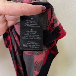 •Features: Black and red floral faux wrap dress. Jersey fabric. Wraps across bodice and waist (not a full wrap) ties in back. Deep plunge bust.