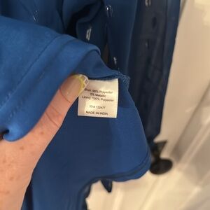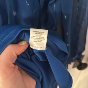 Chic azure dress with silver dots and sheer long sleeves. Ideal for stylish outings. Fully lined body. Tie option at neckline. Perfect for summer work or wedding season.