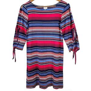 NWOT Cupio Colorful Striped Bodycon Cold Shoulder Dress w/ Tie Sleeves Sz M
