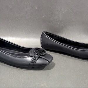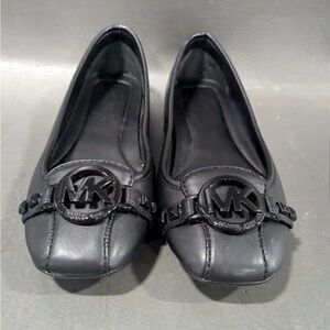 Chic black flats with iconic MK logo. Sleek and versatile design. Ideal for everyday wear.