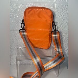 Stylish orange crossbody bag. Features a wide striped strap. Perfect for everyday use.