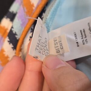 Colorful high-waisted bikini bottom with stripes. Features orange, purple, and blue hues.
