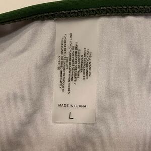New without tags, olive green large bikini bottom. Army green color w gold tone hoop detail at sides. Hardware is plastic. Brazilian like cut. Cheeky. Unbranded. Hygiene liner intact. Measures approximately 15.5” laying flat from ring to ring, unstreched (measuring fabric only). Photos are a part of the description. Color may vary with lighting/device. Stock pics on cover pic are not actually bottom, shown for style.