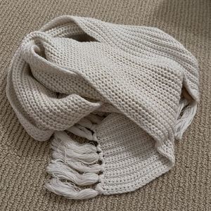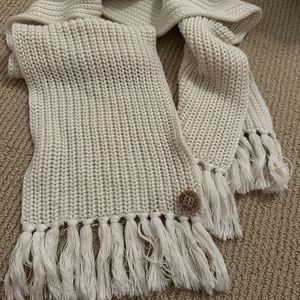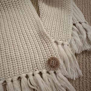 NWOT RARE UGG Women’s Chunky Knit Scarf with Fringe in Cream Color, older style with brown button instead of stitched logo, only worn once, in perfect condition