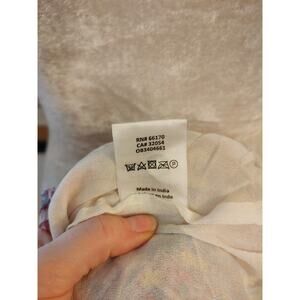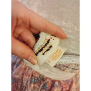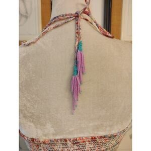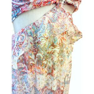 New without tags Rococo Sand Paola halter maxi dress. Cutout with bandeu bust and halter tie straps with beaded tassels. Ruffle at waist. Ruffle hem. Metallic floral in white, pink & blue.