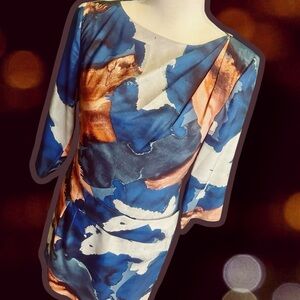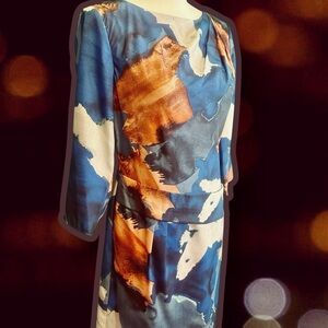 NWOT Vince Camuto Blue & Copper Abstract Watercolor Print Pleated Shift Dress 8