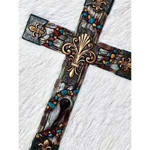 •Style: The cross has a rustic or Southwestern aesthetic, incorporating elements like weathered finishes and a multi-layered appearance.