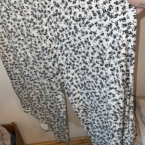 Stylish floral print jumpsuit with a relaxed fit. Features a black and white pattern. Beautiful