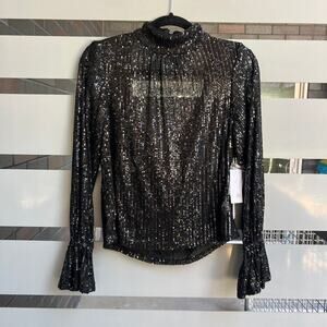 NEW with tags 1.State black drape back sequin blouse. Dazzling sequin top punctuated with a drapey open back and fabulously flared long sleeves. Mock neck. Size XS (fits oversized) - 20.5" pit to pit; 25.5" sleeve.