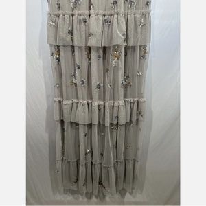 Dreamy ruffle layered full-length dress with sheer cap sleeves and delicate floral sequin accents.