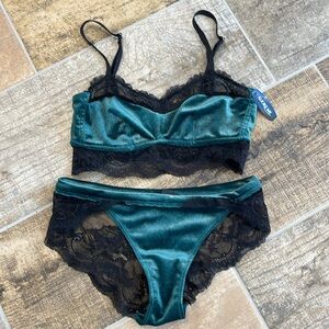 NWT Adore Me Black Lace & Green Velour Bralette Underwear Set Size XS/S