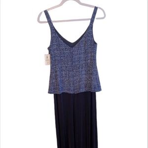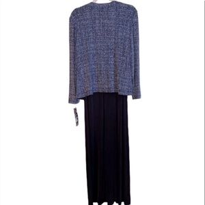 Alex Evenings 3 piece floor length, Maxi gown dress. NEW WITH TAGS! Sleeveless glittery navy top with matching jacket and floor length black flowing skirt attached. Flattering and forgiving on the figure. Size 8. Measurements are from top of shoulder to bottom of gown, top of navy glittery top to bottom of top, and armpit to armpit. New with tags!!