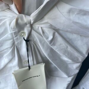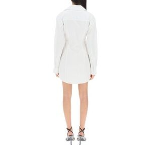 Cotton poplin mini dress by Alexander Wang with knot-detail front placket. It features spread collar, puff sleeves, two-button curved cuffs and curved hem. Shaped at waist and provided of a side invisible zip fastening. Slim fit. The model is 177 cm tall and wears a size US 2.   Material: