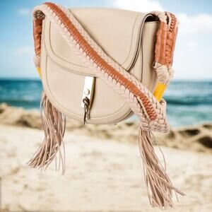 Tan leather Altuzarra Ghianda saddle bag with gold-tone hardware, detachable bullrope shoulder strap with fringe accents at sides, single zip pocket at back, protective feet at base, tonal canvas lining, dual interior pockets; one with zip closure and magnetic lift-lock closure at front flap.