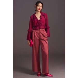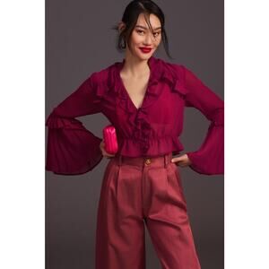 This airy long-sleeve blouse by Anthropologie is sure to become your new Bohemian favorite! Featuring ruffled accents all around, this violet top is sheer perfection for warm weather style.
