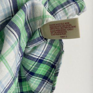 Green, Blue (Navy) & White plaid pattern. "Buttons" are snaps down the front, as well as two additional snaps near the wrist area. Sleeves can be rolled up. Perfect for the fall!