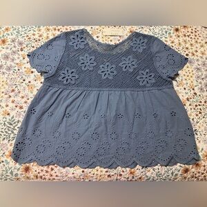 This short-sleeved blouse by Artelier Nicole Miller features a stunning blue hue with intricate eyelet embroidery, offering a chic and romantic touch. The cropped design and embellished details create a stylish silhouette, perfect for a casual yet elegant look.NWT