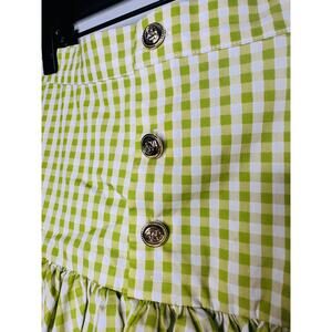 Add a playful twist to your wardrobe with the Caroline Constas Reina Bubble Hem Mini Skirt in Pistachio Gingham, size XS. Crafted from lightweight, low-stretch poplin, this skirt features a charming green and white gingham pattern that exudes timeless appeal. The bubble hem design adds a voluminous, flirty silhouette, while gold-tone crest buttons and a button fly closure lend a touch of sophistication. Measuring approximately 15 inches in length, it offers a flattering mini cut perfect for warm-weather outings. Fully lined with 100% cotton for comfort, this skirt pairs effortlessly with crisp blouses or casual tees.