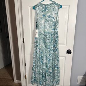 Gorgeous new with tags sleeveless Calvin Klein maxi dress. Ruffle at neck with a split neck with ties. Chiffon outer layer in tiers; fully lined. Gorgeous muted shades of blues, greens, and white, floral pattern. Pullover with tie back, flowy a-line silhouette. 100% polyester.