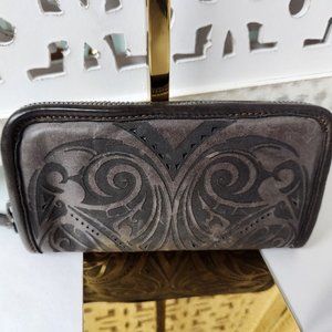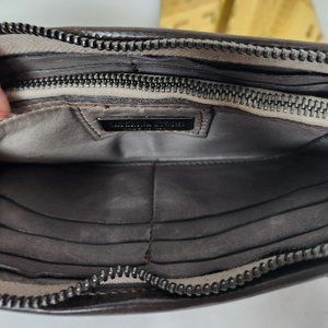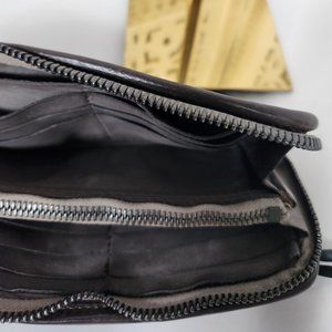 This wallet is done in dark brown leather with a dark taupe cotton interior. Zips from side to side with a leather pull. Inside you'll find 6 leather card slots along with the longer bill slot on each side!! The wallet is divided by another zip in the center of the inside, giving this one plenty of room!