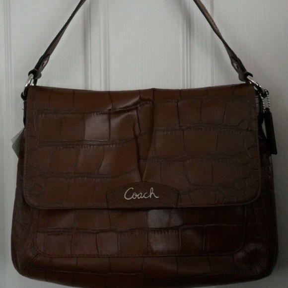 NWT Coach leather EXP FLAP handbag in chestnut. Croc texture on handbag with silver hardware. Magnetic snap closure at flap. Two compartments under flap. The main compartment has two pockets on one side and zipper on the other. Comes with long strap for crossbody. Back of handbag also has extra functional zipper.