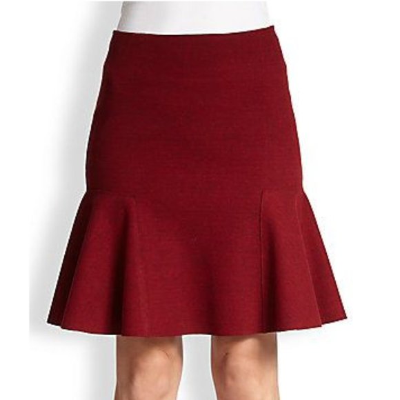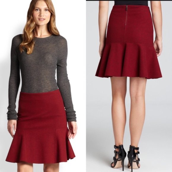 NWT ELIE TAHARI Burgundy Red Mini Skirt 6 SMALL Flounced Hem High Waisted Solid Features - Flounced Hem, High Waisted, Back zip, Zip closure, Fitted