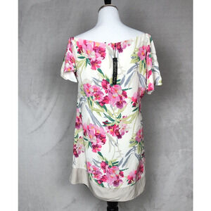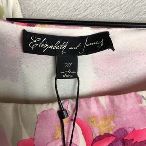 The New With Tags Elizabeth & James Nora Silk Dress in size Medium features a beautiful floral pattern in white and pinks, an asymmetrical hem and offset sleeves and neckline. Made from 100% silk chiffon, this lined dress is perfect for formal occasions such as weddings, parties, and cocktails. The colorful floral design adds a touch of elegance, while the above knee silhouette makes it a stylish choice for the spring and summer seasons.