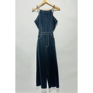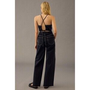 NWT ETICA Cami Halter Black Pearl Denim Jumpsuit Crop Wide Leg Size L